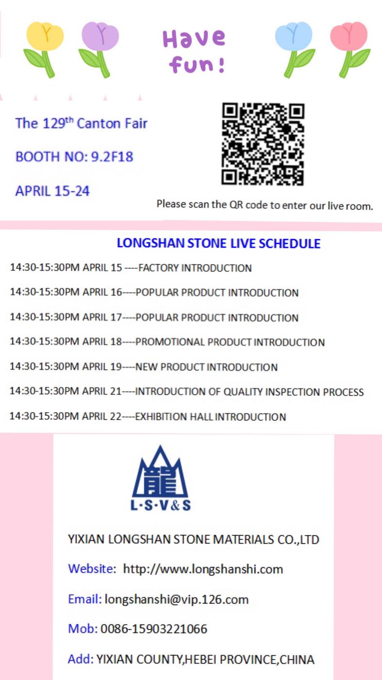 2021年4月15日到4月24日為期10天的第129屆廣交會線上展正式拉開帷幕,歡迎廣大朋友進入龍山石材的直播間觀看。