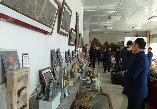 接著耿總帶各位領導到龍山石材展廳參觀。耿總將易縣的花崗巖系列及文化石系列產品進行了詳細解說,并重點介紹了我們自主研發的美泉石加濕器。袁主席一行對龍山的產品有極高的興趣,并就生產及銷售等環節進行了詢問。耿總就客人提出的問題也一一做了具體解答。